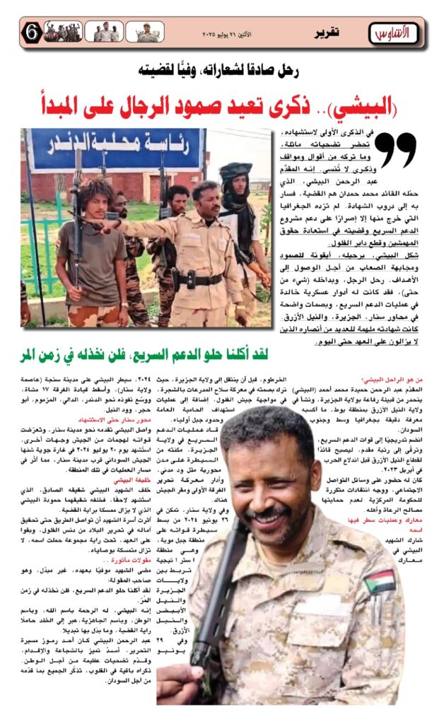 في هذه الذكرى الأولى لإستشهاده، تحضر ماثلة تضحياته، وما تركه من أقوال وذكرى لا تنسى إنه المقدم عبد الرحمن البيشي، القائد محمد حمدان حمّله هم القضية إلى دروب الشهادة، لم تزيده الجغرافية التي خرج منها الا إصراراً لدعم مشروع الدعم السريع وقضيته لإستعادة حقوق المهمشين وقطع دابر الفلول. البيشي شكل برحيله أيقونة للصمود ومغالبة الصعاب للوصول إلى المرامي والأهداف رحل الرجل وبداخله شئ من حتى، فقد كانت له أدوار عسكرية خالدة في عمليات الدعم السريع، وبصمات في محاور سنار، الجزيرة والنيل الأزرق. كانت شهادته ملهمة للعديد من أنصاره الذين مازالوا على العهد حتى اليوم.