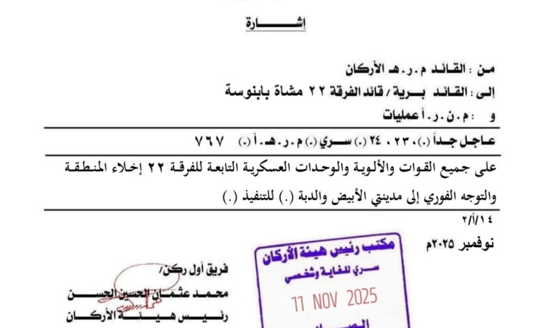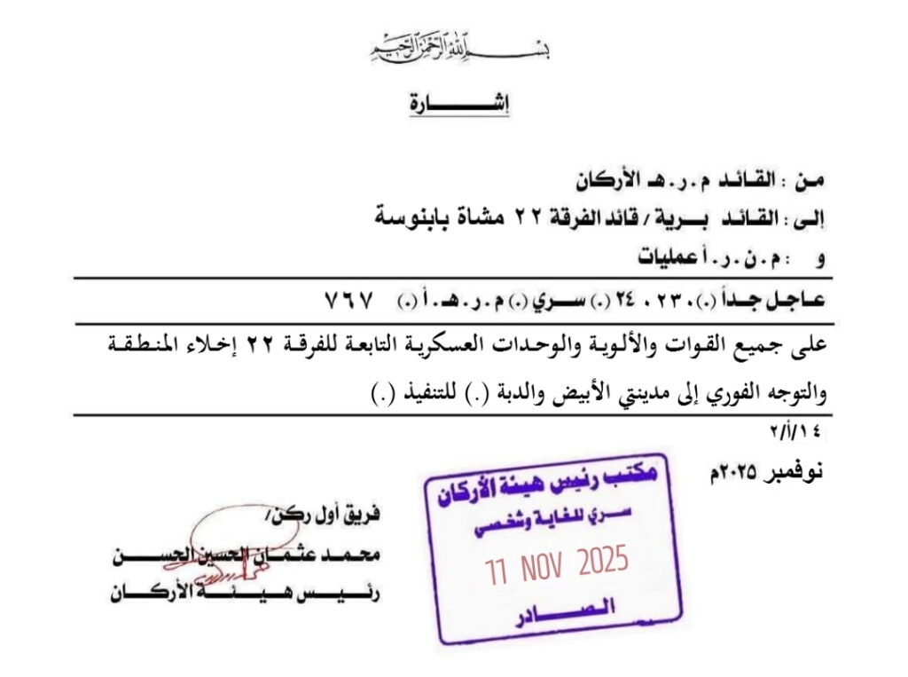 أصدرت رئاسة هيئة الأركان بالجيش السوداني توجيهات عاجلة بسحب جميع القوات والألوية والوحدات التابعة لـ الفرقة 22 مشاة من مواقعها في مدينة بابنوسة، مع إخلاء المنطقة بشكل كامل، والتوجه الفوري إلى مدينتي الأبيض والدبة، وفقًا لمذكرة عسكرية رسمية تحمل توقيع رئيس هيئة الأركان الفريق أول ركن محمد عثمان الحسين بتاريخ 11 نوفمبر 2025.