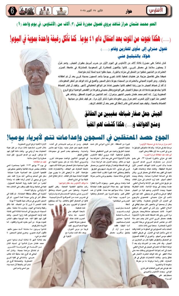 ضيفنا حكى تفاصيل حزينة عن عمليات تصفية كانت تجري يوميًا بأحد السجون بمدينة كرري بعد أن تم اعتقاله وأبناؤه، وعن الموت المجاني بالعشرات من السجناء جوعًا داخل السجن.