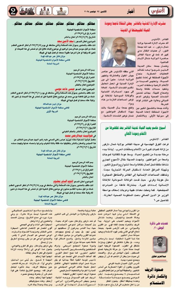 حكمت غيابيا للمدعية صفاء ابوزيد عباس \علي المدعي عليه \ضو البيت عبدالرحمن الغائب عن هذا المجلس والمعلن بالنشر بتطليقها منه طلقة بائنة للغياب وامرتها باحصاء عدتها وفهمت مسنده لتاريخ \20\11\2025م