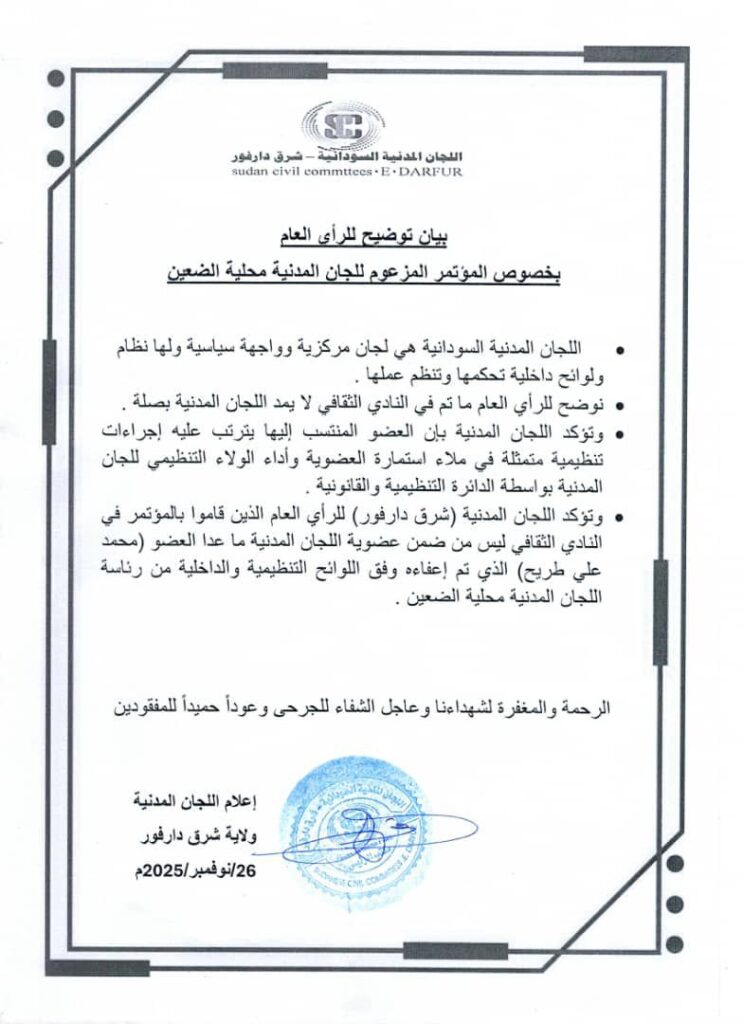 أصدرت اللجان المدنية بمحلية الضعين بياناً توضيحياً للرأي العام حول المؤتمر الذي أُقيم في النادي الثقافي بمدينة الضعين في 26 نوفمبر 2025، مؤكدة أنه لا يمت بصلة إلى اللجان المدنية الرسمية. وأوضحت أن اللجان المدنية كيانات مركزية ذات نظام ولوائح واضحة، لا تُكتسب عضويتها إلا عبر إجراءات تنظيمية تشمل تعبئة استمارة العضوية وأداء الولاء التنظيمي أمام الدائرة القانونية المختصة.